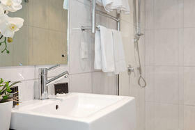 The stunning bathroom upstairs, which services the 2 remaining bedrooms, has a good sized shower, vanity, heated towel rail and toilet.